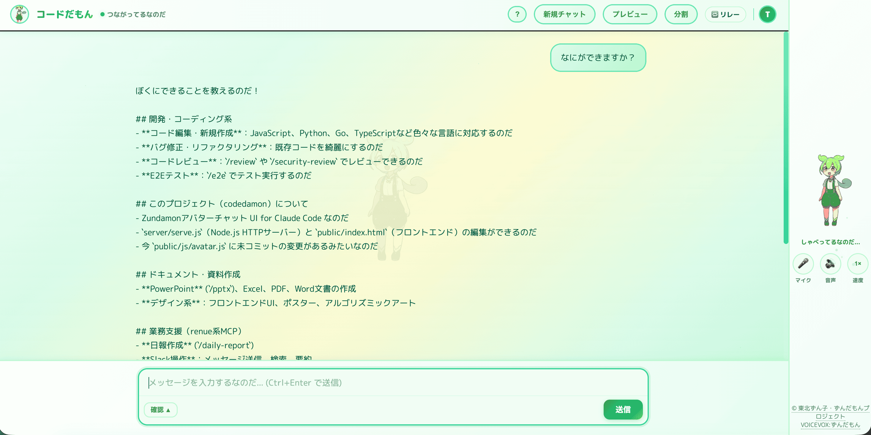 Claude の応答をキャラクター「ずんだもん」が音声で読み上げ。一人で作業している夜も寂しくありません。